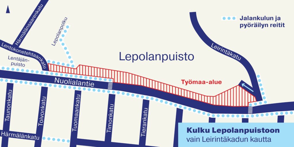Lepolanpuistoon kulkeminen ja sieltä poistuminen on tällä hetkellä mahdollista vain Leirintäkadun kautta. Alueelle lisätään opasteita kulkureiteistä. Muutos on voimassa toistaiseksi.