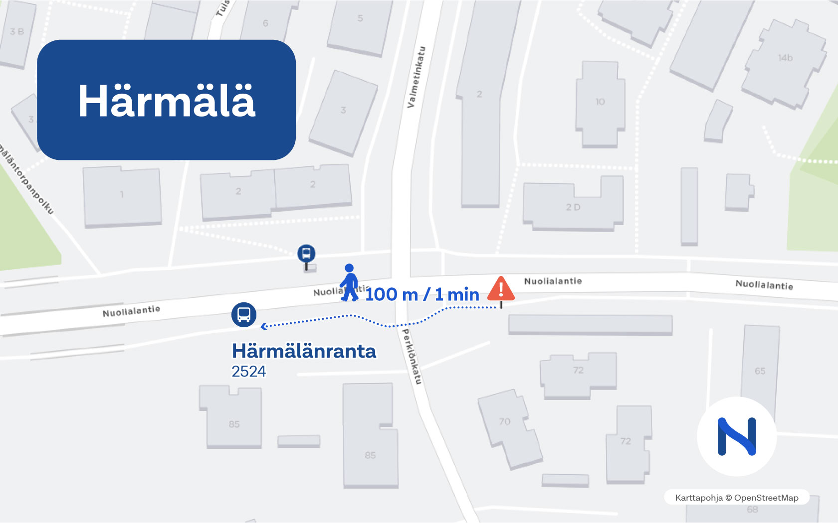 Lisäksi Nuolialantien eteläpuolella sijaitseva keskustan suunnan bussipysäkki Härmälänranta 2524 siirretään 8.1.2025 alkaen noin 100 metriä länteen, Perkiönkadun liittymän länsipuolelle. Joukkoliikenteen muutoksista löytyy tietoa myös Nyssen sivuilta.