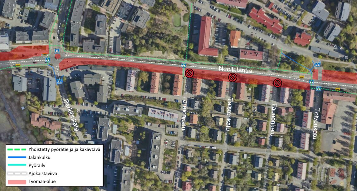 Tarmonkadun, Taistonkadun ja Taunonkadun liittymät Nuolialantielle suljetaan osuudella Toivonkatu-Valmetinkatu tehtävien vesihuoltotöiden vuoksi. Jalankulku ja pyöräily opastetaan Nuolialantien pohjoispuolelle. Autoliikenne Nuolialantieltä Tarmon-, Taiston- ja Taunonkaduille kulkee Toivonkadun ja Härmälänkadun/Perkiönkadun kautta. Jalankululle ja pyöräilylle pyritään pitämään kulkuyhteys edellä mainittujen lisäksi myös Tarmonkadun kohdalta.