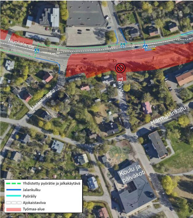 Talvitien ja Nuolialantien liittymässä tehdään heti loppiaisen jälkeen raitiotietöiden yhteydessä toteutettavia kunnallistekniikan johtosiirtotöitä sekä poikittaisia johtolinjoja liittymän alitse. Talvitien eteläinen liittymä suljetaan, ja töiden aikana pääsy Talvitielle on muiden liittymien ja Härmälänkadun kautta. Jalankulku ja pyöräily opastetaan Nuolialantien pohjoispuolelle. Osa liikennejärjestelyistä tehdään torstain ja perjantain 9.–10.1. välisenä yönä. Töistä saattaa aiheutua melua lähialueelle.