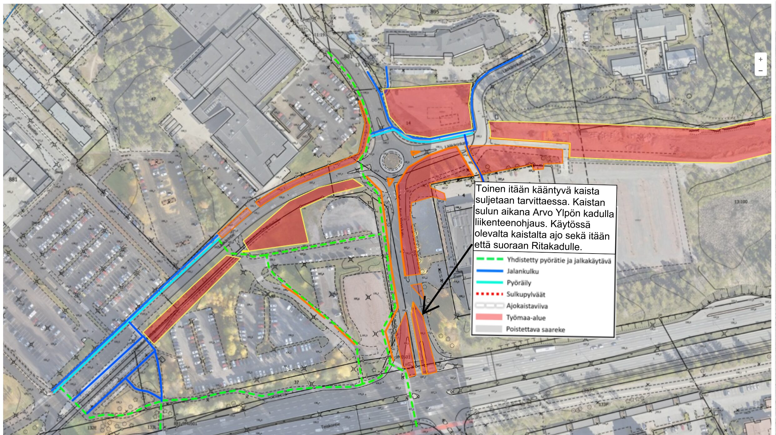 Arvo Ylpön kadulla työalue on laajenettu viikolla 4 kadun keskiosaan, minkä vuoksi kadulta voidaan ajoittain joutua poistamaan toinen Teiskontielle idän suuntaan kääntyvien kaista. Kaistan poiston tarve arvioidaan sen perusteella, miten kaivuutyöt liikenteen joukossa pystytään turvallisesti hoitamaan. Jos kaista joudutaan sulkemaan, ohjataan Arvo Ylpön kadun liikennettä liikenteenohjaajien toimesta ruuhkautumisen välttämiseksi. Ruuhka-aikoina kaistan sulkemista pyritään ensisijaisesti välttämään. Työvaiheen kesto on arviolta muutamia päiviä. Myös Arvo Ylpön kadun itäreunan jalankulku- ja pyöräväylä on suljettu. Jalankulku- ja pyöräreitit kulkevat kadun länsireunassa sekä Arvo Ylpön kadun ja Lääkärinkadun kulmassa sijaitsevan tontin eteläpuolella. Kulkureitteinä hyödynnetään myös länsipuolella sijaitsevan pysäköintialueen kulkuväyliä.