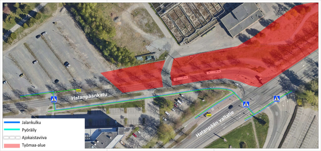 Hatanpäällä työalue laajenee Hatanpään valtatien ja Hatanpäänkadun risteysalueelta länteen, Hatanpäänkadun pohjoispuolelle, ja ajokaistat sekä jalankulku- ja pyöräväylä siirtyvät kadun eteläreunaan. Samalla Hatanpäänkadun ylittävä suojatie siirtyy hieman länteen. Liittymä Hatanpäänkadulta jätevedenpuhdistamolle pysyy käytössä, mutta sen sijainti voi vaihdella töiden edetessä. Työt eivät vaikuta bussipysäkkeihin Sarvis ja Hatanpään vt 25.