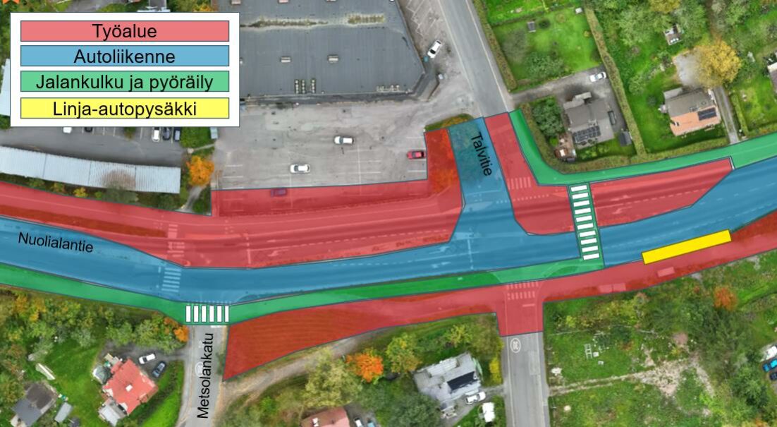 Härmälässä Nuolialantien ja Talvitien liitymässä tehdään kunnallistekniikan johtosiirtotöitä sekä poikittaisia johtolinjoja liittymän alitse, minkä vuoksi autoliikenne sekä jalankulku ja pyöräily siirretään liittymän eteläreunaan. Talvitiestä itään jalankulku ja pyöräily kulkee Nuolialantien pohjoispuolella.