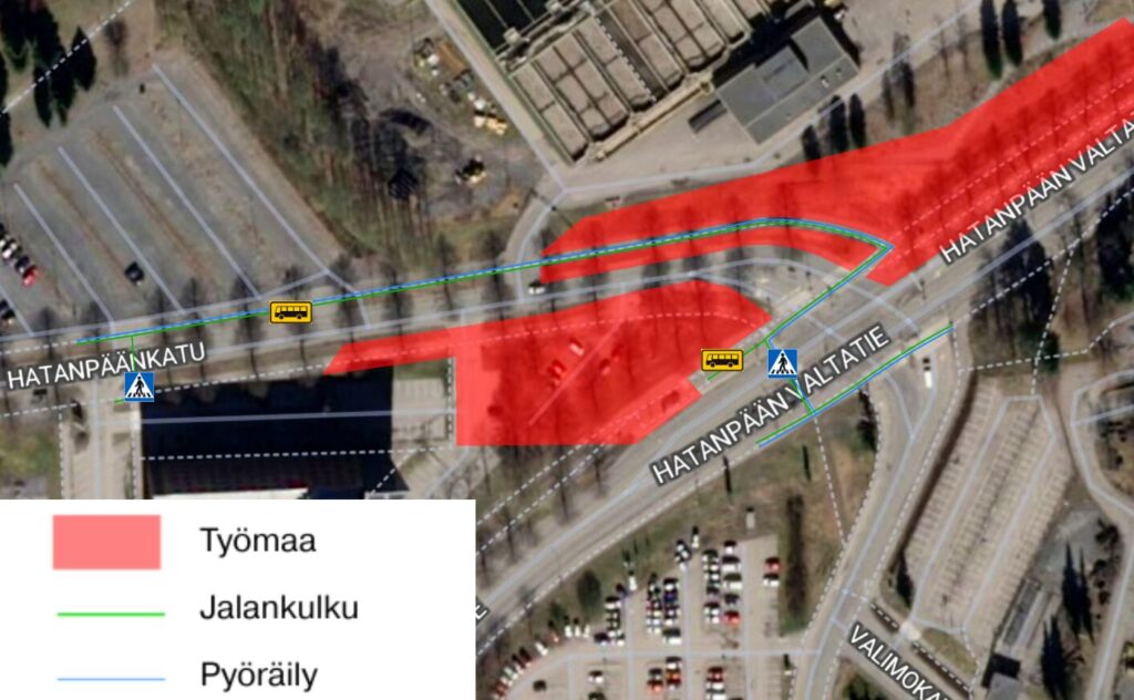 Tampereen Ratikan Pirkkala–Linnainmaa -allianssin vesihuoltotyöt etenevät Hatanpäällä. Töiden vuoksi Hatanpäänkadun ja Hatanpään valtatien liittymässä tulee käyttöön uusia liikennejärjestelyjä viikolla 17.