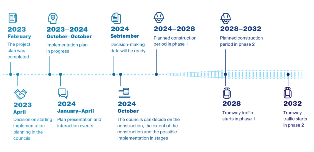 In their April 2023 decisions, the Pirkkala and Tampere councils made the construction decision conditional on securing state aid for construction. On 21 October 2024, the councils of Tampere and Pirkkala decided on the construction and phasing on the basis of options prepared by the Pirkkala-Linnainmaa Alliance. First construction works for phase 1 started in December 2024.