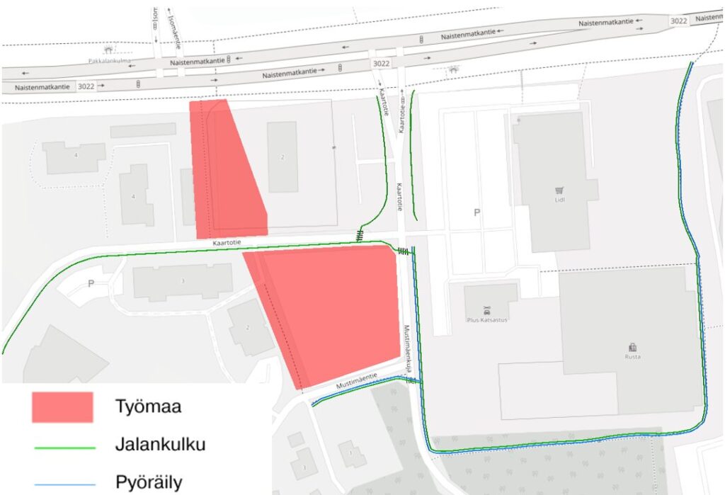 Kaartotien avaamisen myötä kadun yhdistetty jalankulku- ja pyöräväylä palautetaan jalkakäytäväksi ja pyöräily siirtyy takaisin ajoradalle. Mustimäentiellä ja Mustimäenkujalla on yhdistetty jalankulku- ja pyöräväylä.