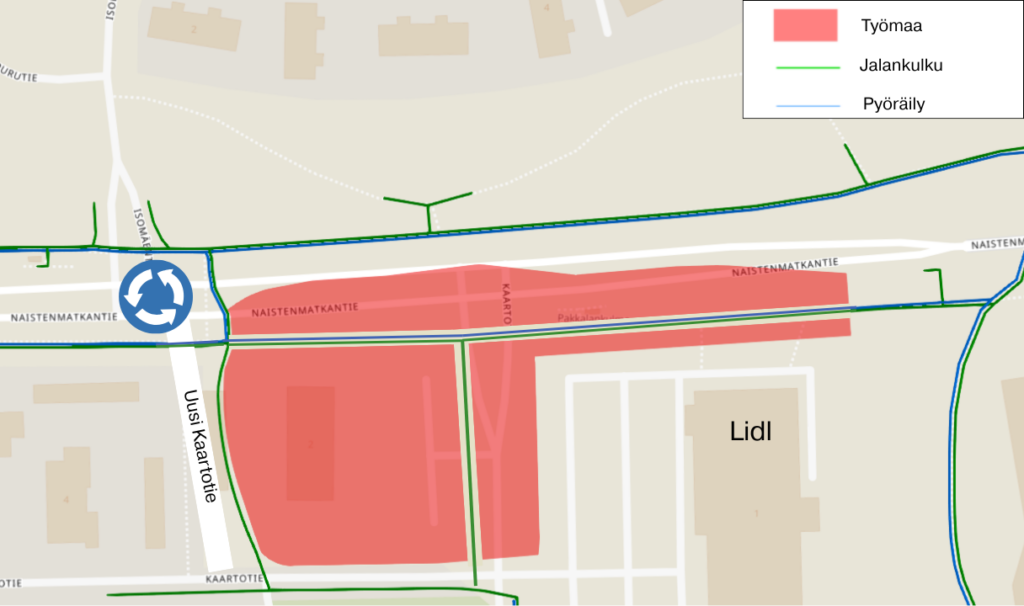 Kaartotien liittymän lisäksi kesäkuun aikana avataan uudet liittymät myös Lidlin ja Lestipolun kohdalta Naistenmatkantielle.