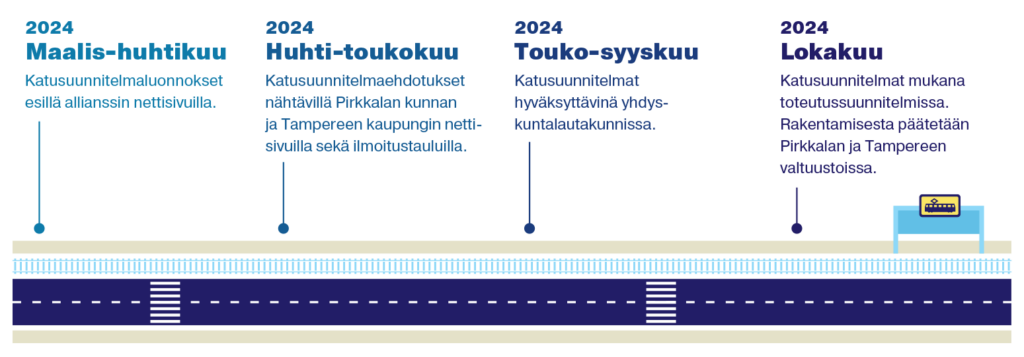 Olemme suunnitelleet kaduittain raitiotien ja siihen liittyvät katu- ja liikennejärjestelyt. Katusuunnitelmiin voi tutustua tällä sivulla. Katusuunnitelmaehdotukset olivat virallisesti nähtävillä Tampereen kaupungin ja Pirkkalan kunnan toimesta vaiheittain huhti–heinäkuussa 2024, ja niistä oli mahdollista jättää muistutuksia kirjaamoihin. Osallistumis- ja vuorovaikutusmenettelyistä löytyy lisätietoa sivun alaosassa olevista osallistumis- ja arviointisuunnitelmista. Tällä sivulla voi myös tutustua rakentamisen aikaisten liikennejärjestelyjen suunnitelmiin.