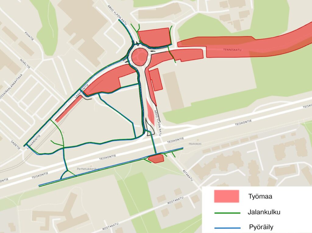 - Arvo Ylpön kadun itäreunan jalankulku- ja pyöräväylä on suljettu. Jalankulku- ja pyöräreitit kulkevat kadun länsireunassa sekä Arvo Ylpön kadun ja Lääkärinkadun kulmassa sijaitsevan tontin eteläpuolella. Kulkureitteinä hyödynnetään myös länsipuolella sijaitsevan pysäköintialueen kulkuväyliä.