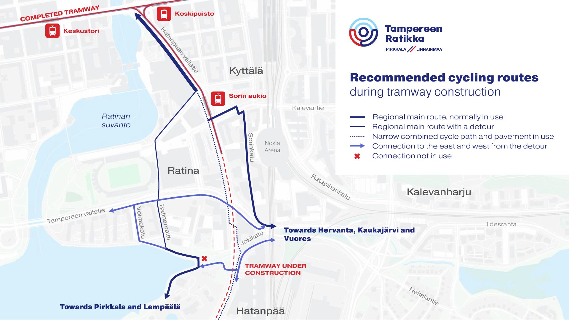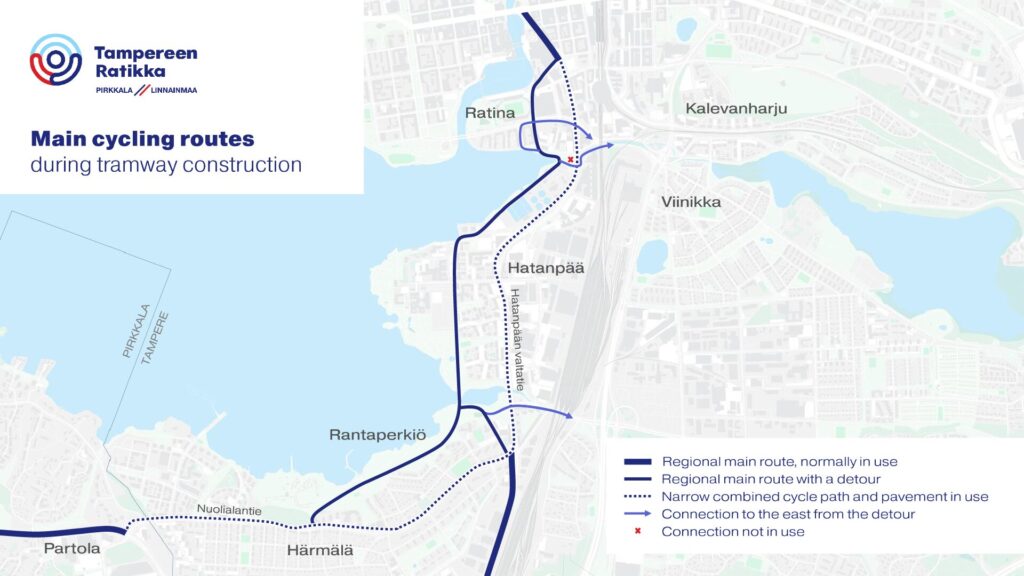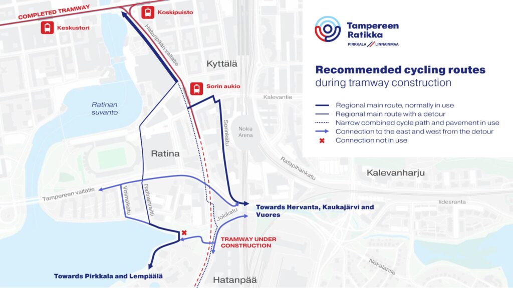 Main cycling routes directed to detours during the construction of the Pirkkala–Linnainmaa tramway