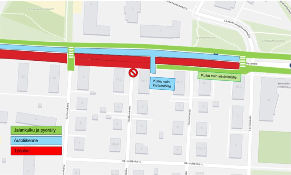 Nuolialantiellä johtosiirrot ja uusien hulevesilinjojen rakentaminen etenee kohti itää. Töiden vuoksi Nuolialantien ylittävä suojatie siirretään Taistonkadulta takaisin Tarmonkadun kohdalle keskiviikkona 19.2. Taistonkadun kiinteistöille kulku tapahtuu Härmälänkadun kautta. Nuolialantien eteläpuolen jalankulku- ja pyöräväylä Toivonkadulta on vain Taunonkadun kiinteistöille kulkua varten.