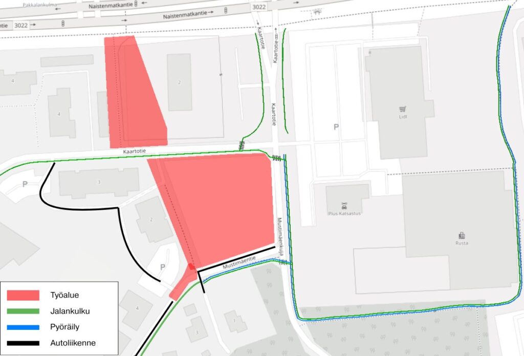 Kulku kiinteistöille Mustimäentie 1 ja 3 pysyy auki, mutta muut Mustimäentien kiinteistöt ohjataan kiertoreittiä Elinantien kautta. Lisäksi kiinteistöille Mustimäentie 2 ja Kaartotie 3 ohjataan reitti Kaartotielle kiinteistöjen pelastustien kautta.