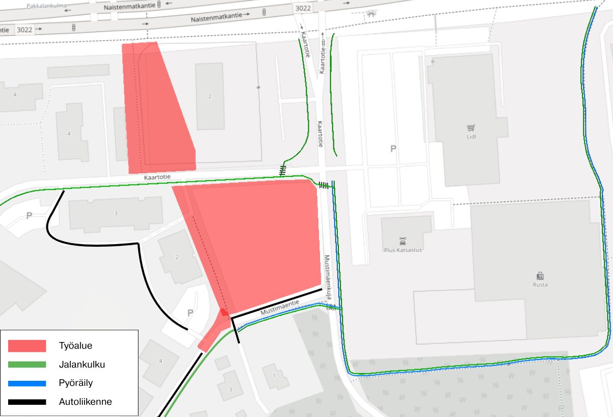 Kulku kiinteistöille Mustimäentie 1 ja 3 pysyy auki, mutta muut Mustimäentien kiinteistöt ohjataan kiertoreittiä Elinantien kautta. Lisäksi kiinteistöille Mustimäentie 2 ja Kaartotie 3 ohjataan reitti Kaartotielle kiinteistöjen pelastustien kautta.