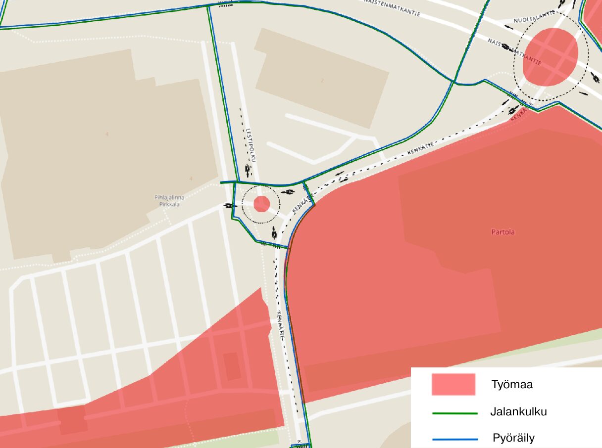 Painopenkereen rakentamistöiden myötä Kenkätien jalankulku- ja pyöräväylä siirretään kulkemaan kadun itäpuolelle Lestipolun ja kauppakeskus Veskan välillä. Samalla Prisman pysäköintialueen ja Motonetin välinen jalankulkuväylä poistetaan käytöstä. Muutokset tehdään viikon 31 alkupuolella.