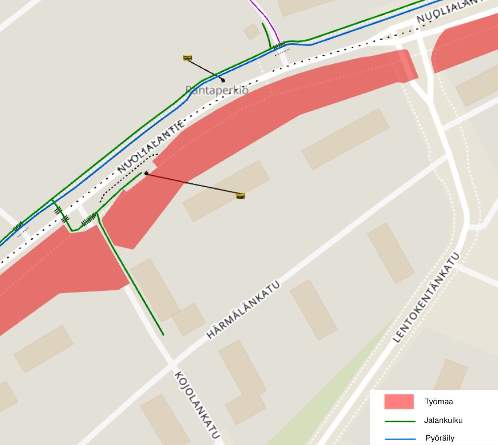 Jalankulku ohjataan Kojolankadun itäreunaa, josta se opastetaan suojatien kautta Nuolialantien pohjoispuolelle. Jalankulkureitin sekä suojatien paikat voivat töiden aikana hieman vaihdella. Kulkuyhteys bussipysäkille Rantaperkiö 2513 säilytetään kaikissa työvaiheissa.