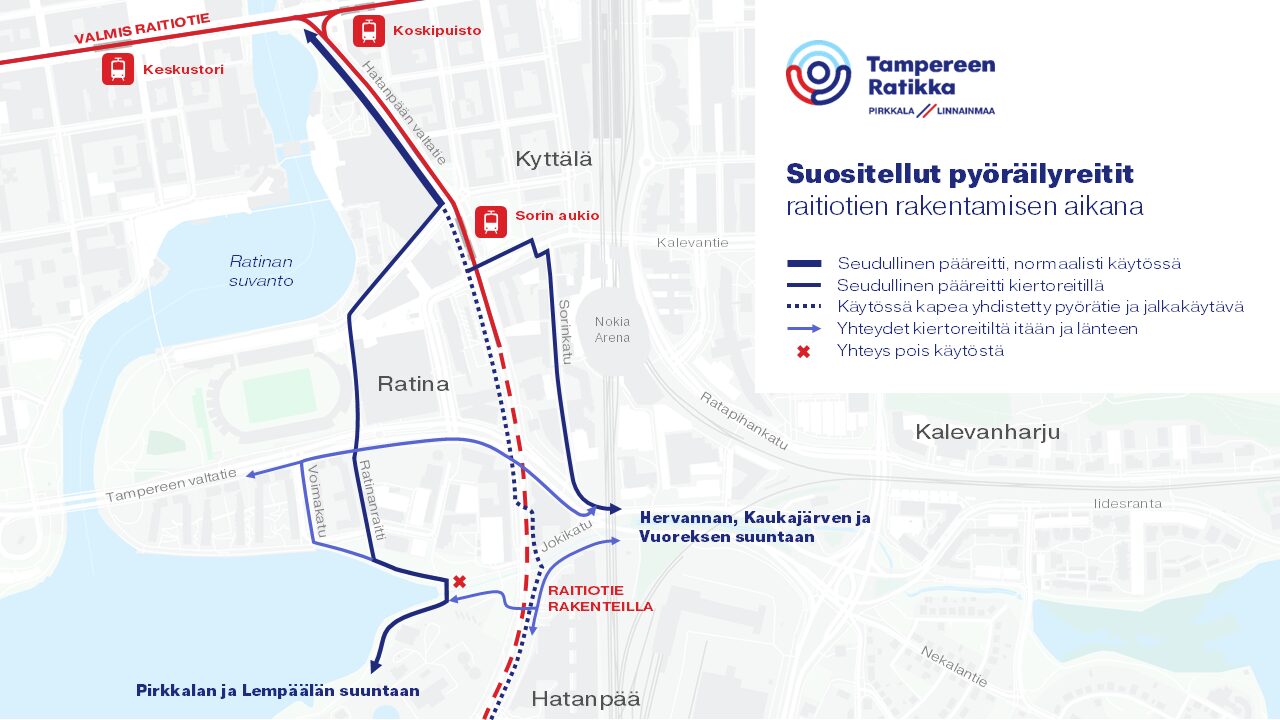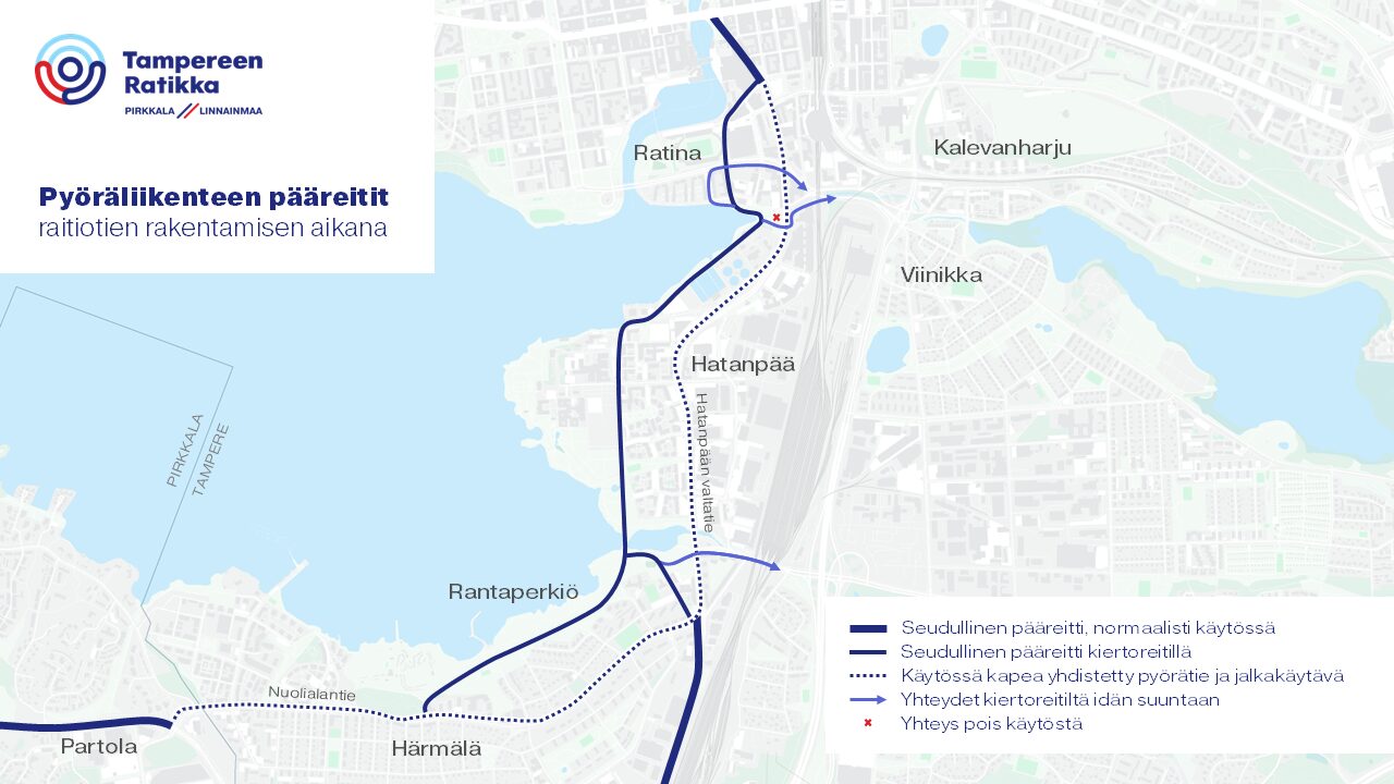 - Raitiotien rakennustyöt siirtävät pyöräilyn seudullisia pääreittejä. Uusi pääreitti kulkee Hatanpään läpi pitkin Vihilahdenkujan puistoreittiä ja Härmälässä pitkin Pyhäjärven rantareittiä. Lisää tiedotteessa