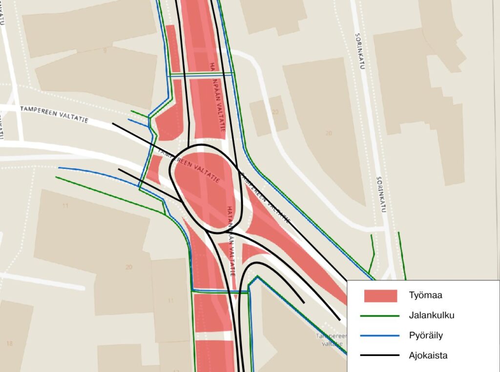 - Hatanpään valtatien ja Tampereen valtatien risteyksessä on käytössä liikenneympyrä arviolta kesään 2027 saakka.