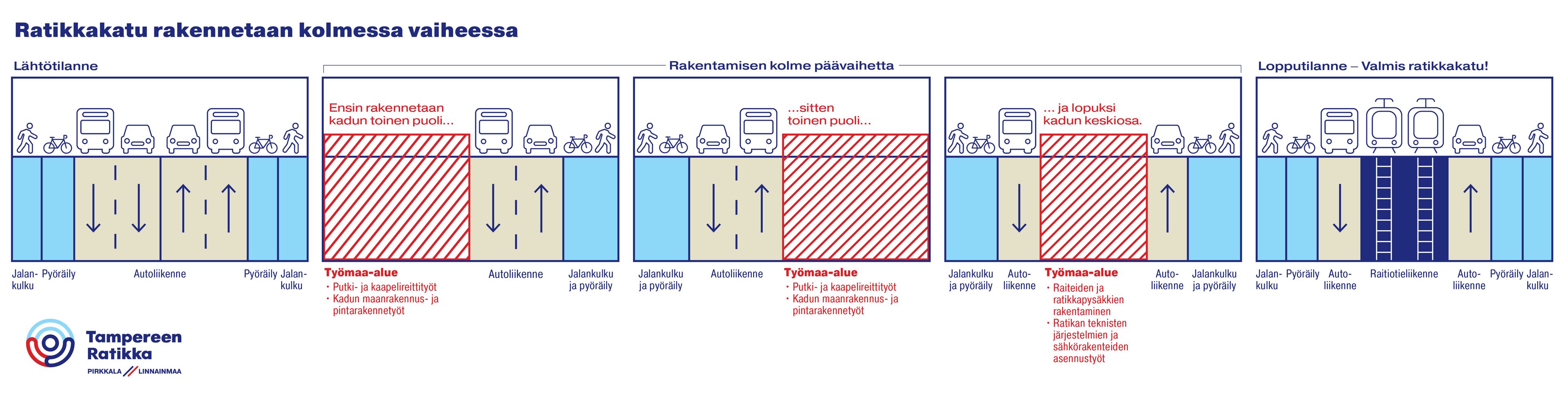 Ratikan reitti laajenee sen ensimmäisessä vaiheessa Sorin aukiolta Partolaan ja Kaupin Kampukselta Ruotulaan vuosien 2024–2028 aikana. Vaikka raitiotiehankkeen laajuus ja kesto voivat tuntua pitkiltä, hankkeen aikataulutuksen periaatteena on kuntalaisten sujuvan arjen ja kaikkien kulkumuotojen turvallisen liikkumisen takaaminen koko rakentamisen ajan.